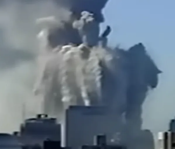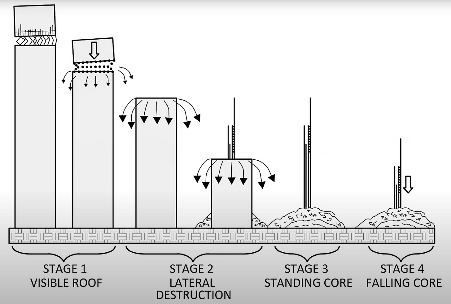 - This stage reveals the outward motion of the tower’s structure with the ejection of 4-ton structural steel column sections at 75 mph laterally, landing up to 600 feet in every direction, such that this mass is not even available to crush the building below.