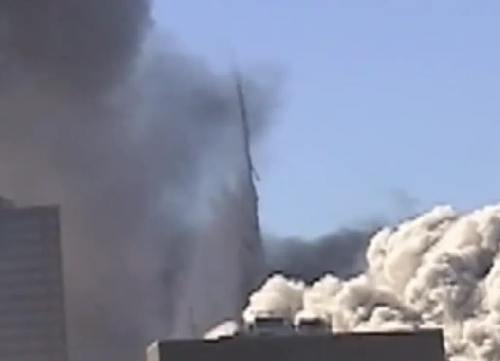 The “spire,” as it has been termed, drifts laterally and then descends at free-fall acceleration. It didn’t turn to dust. You can see it descending, frame by frame, in the video, through the smoke left behind by the explosive destruction process.