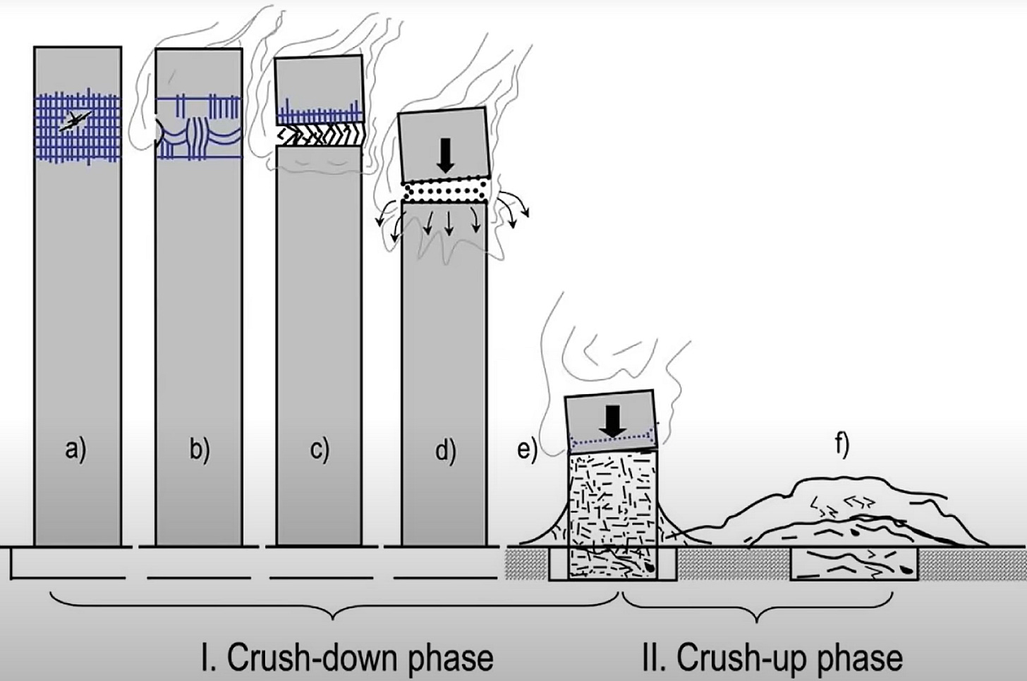 We were treated by Zdenek Bazant to a mathematically obfuscated peer-reviewed paper (submitted just 2 days after 9/11/01, that took engineers 10 years to decode) in which he diagrammed the “Crush-down / Crush-up” collapse process like this: