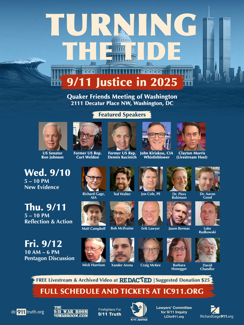 What are YOU doing on the 24th anniversary of 9/11? There are a number of ways to come and join us! For the first time, almost every 9/11 Truth organization has banded together in a major show of unity to create a landmark event, TURNING THE TIDE: 9/11 Justice in 2025 in Washington, DC, with featured talks from a wide range of prominent activists, researchers, and whistleblowers from in and around the 9/11 Truth Movement.