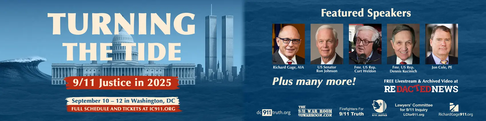 Check it all out on our exclusive Turning the Tide: 9/11 Justice in 2025 page, where you can order your tickets (we really want you there with us!), register for the livestream (we’ll bring you with us one way or the other!), and, just as important, donate to ensure that we can reach everyoneand have a very successful, packed event with 250 attendees arriving from all over the United States!